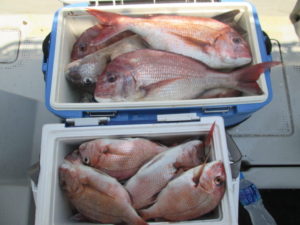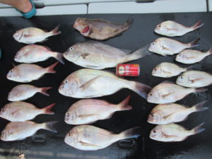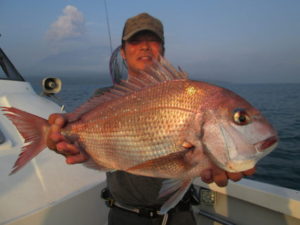 浅場でヒットするため思った以上に引きが強く大物がかかると切られる人が多い。今日も朝方大物からの切られが目立った。釣果は釣る人でキープサイズを20枚以上。