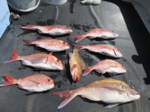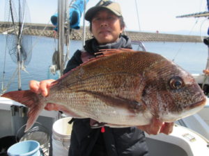 早朝一つテンヤで出船するため港に着いたら風が強く一つテンヤは中止することにし、タイのテンビン釣りに急遽変更した。1時間遅れで1人で出船した伊佐市の堀之内様は強風で船が振られ棚をとりづらい中、昼前までにバラシもあったが2Kを頭に8枚の釣果。湾奥もタイが釣れだした。