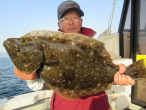 62㎝のヒラメを釣られた湧水町の久米田様。最後に餌アジが釣れ仕掛けを落とした途端大形のヒラメが食ってきたがハリス5号だったため切られてしまった。