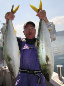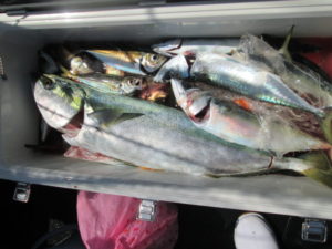 少し大きめの餌アジは釣れたがヒラメは当たらず。大物はブリが3本。切られも何度かあった。アジ、サバは良く釣れる。