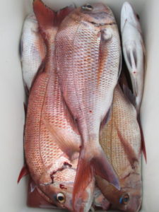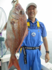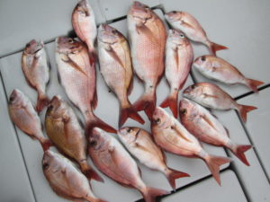 長潮で潮が流れず食いが渋かった。タイは1人15枚前後。