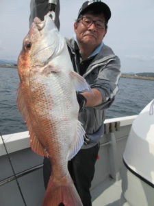 10月半ば過ぎて水深が40~60mと深くなり針掛りが悪くなって来た。この日は60㎝超えを頭に1K以上が4枚、1人10枚前後の釣果だった。