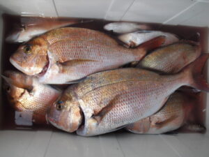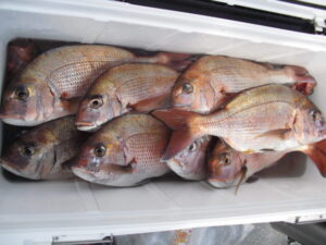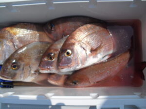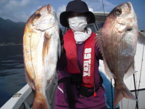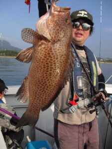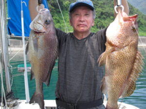 大潮だったが全く潮が流れず食いが悪かった。掛けてもバラシが多くタイは釣る方で15枚程。51㎝のオオモンハタとコロダイの珍しいダブルヒットがあった。