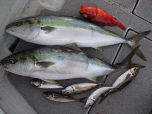 2023年10月6日 / 最終更新日時 : 2023年10月6日 ayamimaru 最新釣果 10月6日 大物五目 昼過ぎから1名様で出船。アジの魚影を探すのに時間はかかったが、釣り始めたら4投で35Lのクーラーに入らなくなり納竿しました。釣果は96㎝のブリ2本、アジ、カサゴ。途中で仕掛けを2回切られた。