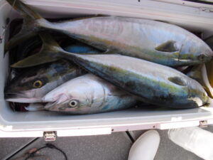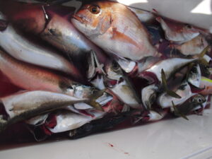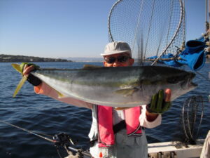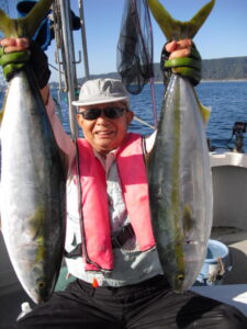 ブリが好調! 1人で5~8Kのブリを4本釣られクーラー満タンになり11時には帰港した。他に大物のアタリは切られ2回、バラシが3回あった。アジ、サバも良く釣れている。