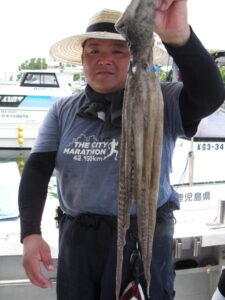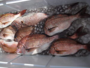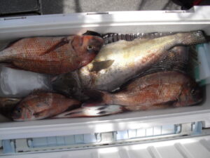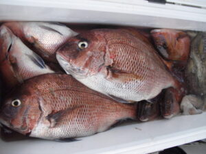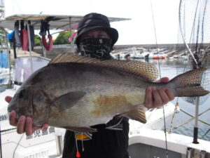 9時過ぎまでは潮が釣りにならないくらい異常に速かった。釣果は1人10枚~15枚。水温が上がり大形のコロダイやタコも釣れ出した。